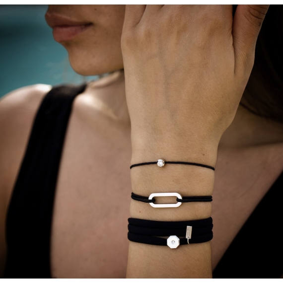 Bracelet taile femme sur cordon, logo et motif en argent 925/1000 rhodié. Cordon ajustable par noeuds coulissants. Livré dans une pochette en velours gravée de la marque et son certificat d’authenticité par colissimo recommandé sous 48 à 72H.