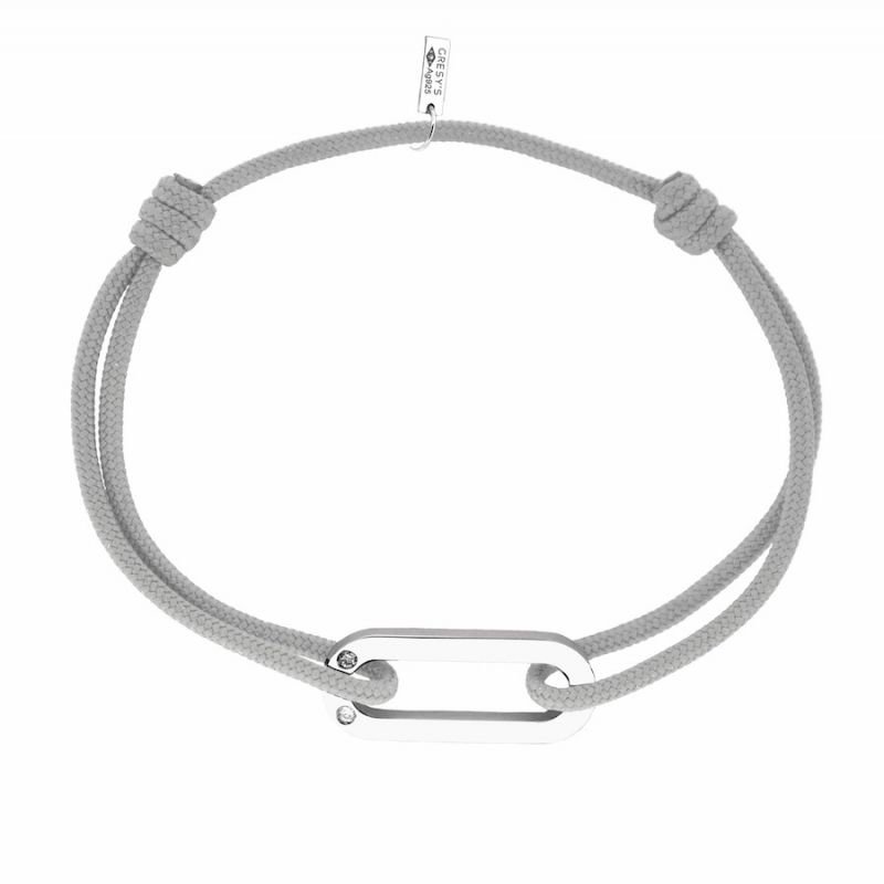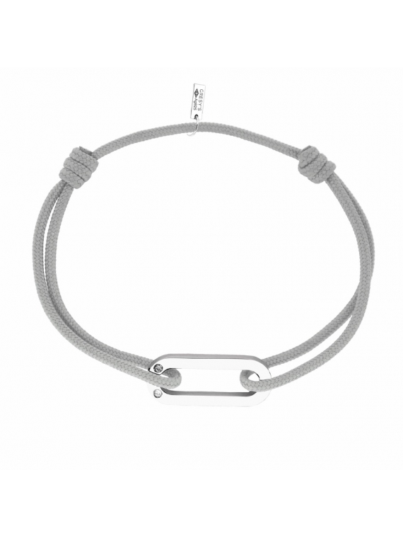 Bracelet sur cordon, logo et motif en argent 925/1000 rhodié, serti de deux diamants de qualité H/SI1 de 0.01ct chacun . Cordon ajustable par noeuds coulissants. Livré dans une pochette en velours gravée de la marque et son certificat d’authenticité par colissimo recommandé sous 48 à 72H.
