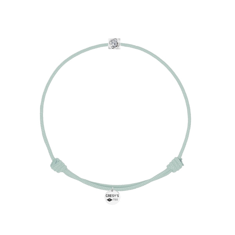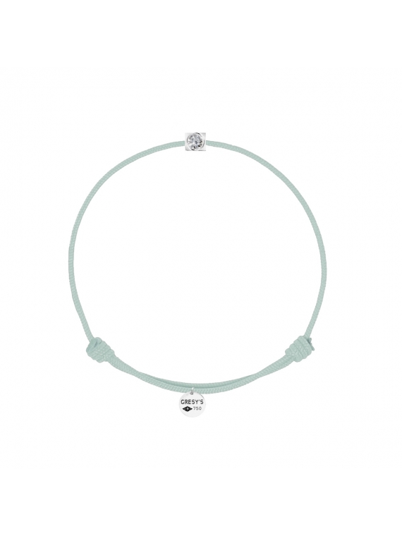 Bracelet taille femme, logo et sertissure en or 750/1000 blanc rhodié, diamant 0.03ct (diamètre 2,00mm) de qualité H/SI1. Cordon ajustable par noeuds coulissants. Livré dans un sac cadeau, une pochette en velours gravée de la marque et son certificat d’authenticité par colissimo recommandé sous 48 à 72H.