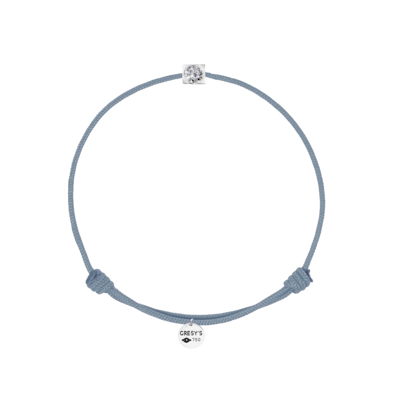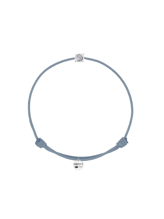 Bracelet taille femme, logo et sertissure en or 750/1000 blanc rhodié, diamant 0.10ct (diamètre 3,00mm) de qualité H/SI1. Cordon ajustable par noeuds coulissants. Livré dans un sac cadeau, une pochette en velours gravée de la marque et son certificat d’authenticité par colissimo recommandé sous 48 à 72H.
