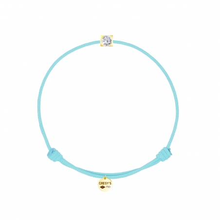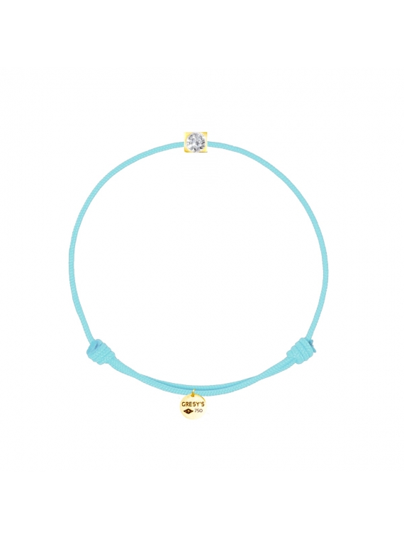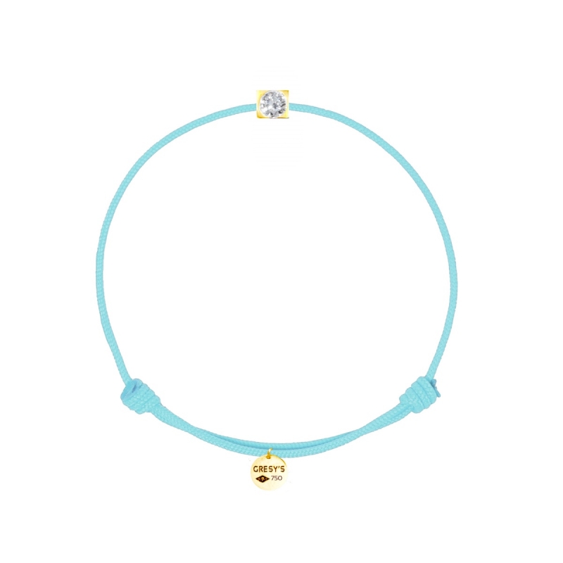 Bracelet taille femme, logo et sertissure en or jaune 750/1000, diamant 0.10ct (diamètre 3,00mm) de qualité H/SI1. Cordon ajustable par noeuds coulissants. Livré dans un sac cadeau, une pochette en velours gravée de la marque et son certificat d’authenticité par colissimo recommandé sous 48 à 72H.