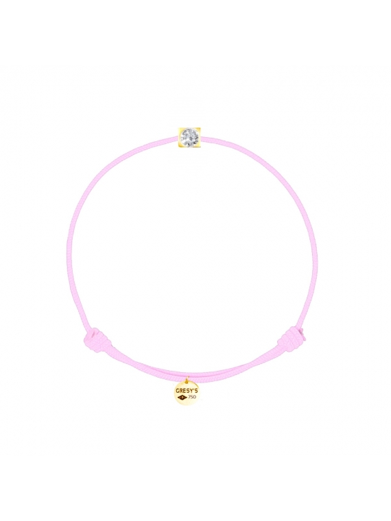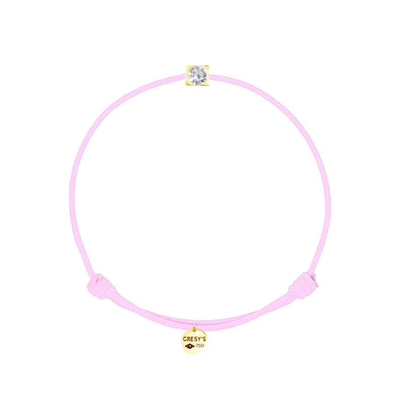 Bracelet taille femme, logo et sertissure en or jaune 750/1000, diamant 0.10ct (diamètre 3,00mm) de qualité H/SI1. Cordon ajustable par noeuds coulissants. Livré dans un sac cadeau, une pochette en velours gravée de la marque et son certificat d’authenticité par colissimo recommandé sous 48 à 72H.