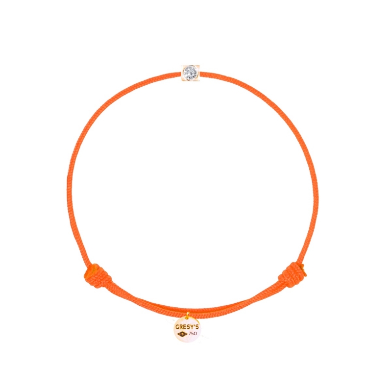 Bracelet taille femme, logo et sertissure en or 750/1000 rose, diamant 0.02ct (diamètre 1,7mm) de qualité H/SI1. Cordon ajustable par noeuds coulissants. Livré dans un sac cadeau, une pochette en velours gravée de la marque et son certificat d’authenticité par colissimo recommandé sous 48 à 72H.