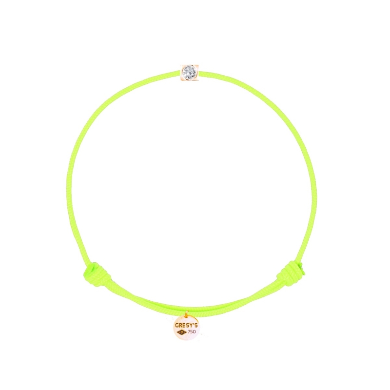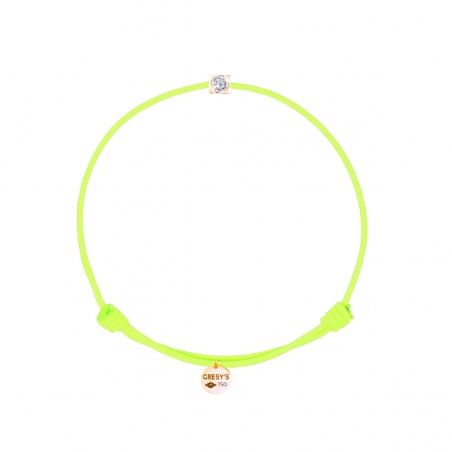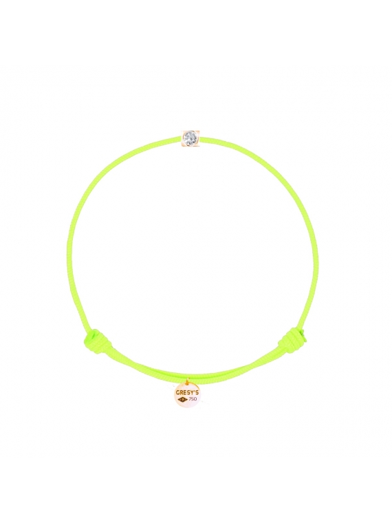 Bracelet taille enfant, logo et sertissure en or 750/1000 rose, diamant 0.02ct (diamètre 1,7mm) de qualité H/SI1. Cordon ajustable par noeuds coulissants. Livré dans un sac cadeau, une pochette en velours gravée de la marque et son certificat d’authenticité par colissimo recommandé sous 48 à 72H.