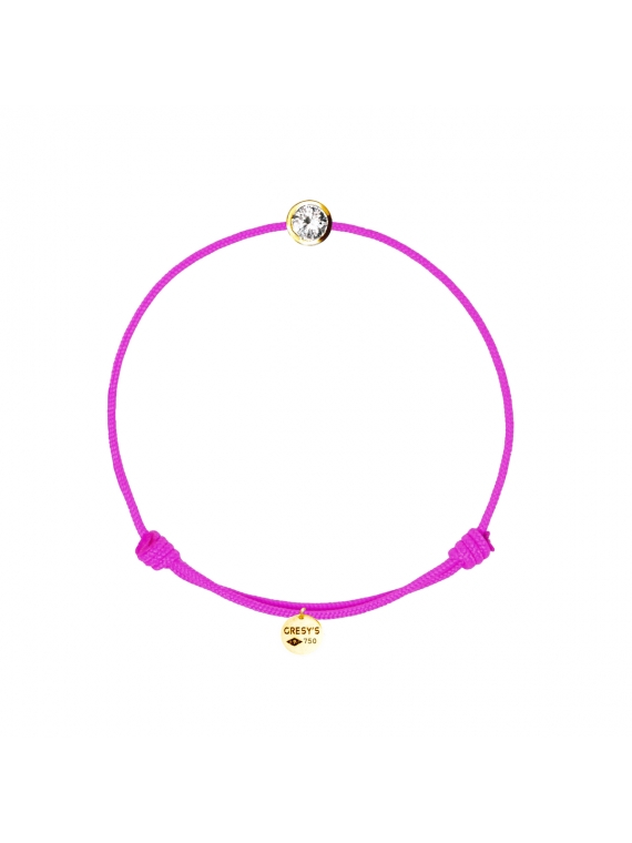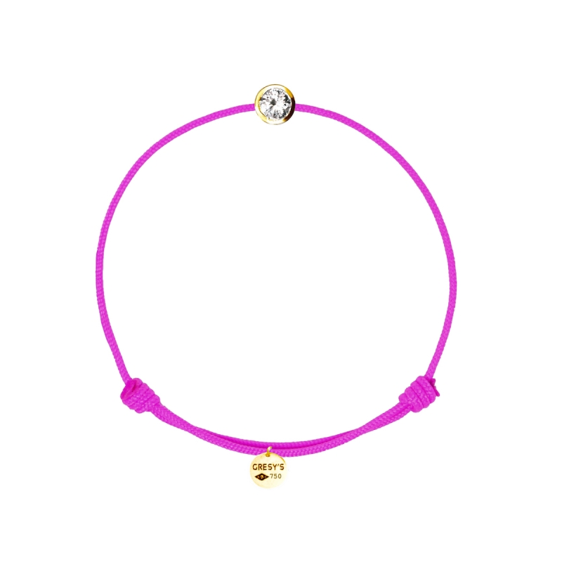Bracelet taille femme, logo et motif en or jaune 750/1000, diamant 0.10ct (diamètre 3.00mm) de qualité H/SI1. Cordon ajustable par noeuds coulissants. Livré dans une pochette en velours gravée de la marque et son certificat d’authenticité par colissimo recommandé sous 48 à 72H.