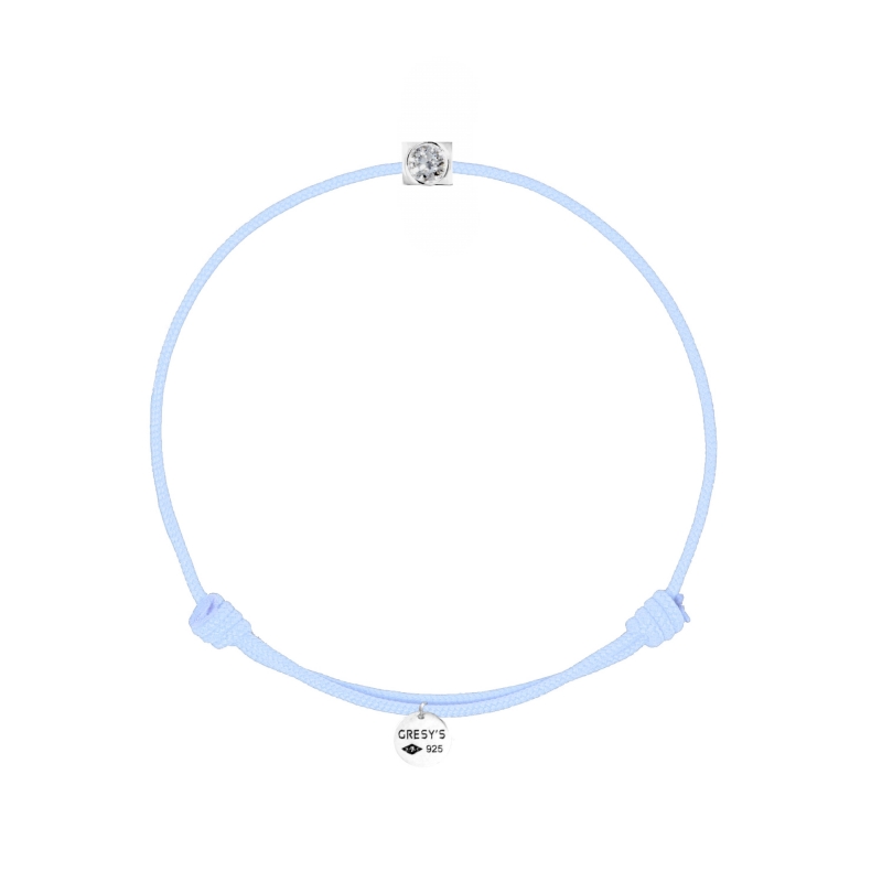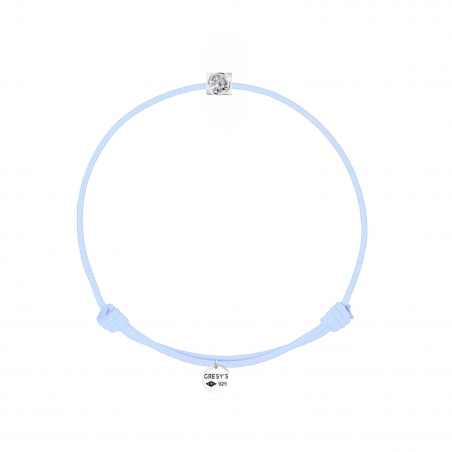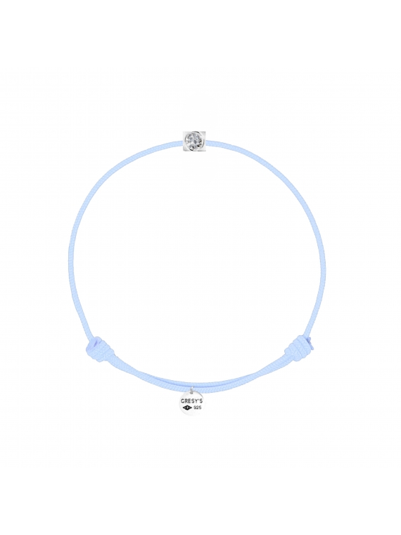 Bracelet taille enfant, logo et sertissure en argent 925/1000 rhodié, diamant 0.05ct (diamètre 2,5mm) de qualité H/SI1. Cordon ajustable par noeuds coulissants. Livré dans un sac cadeau, une pochette en velours gravée de la marque et son certificat d’authenticité par colissimo recommandé sous 48 à 72H.