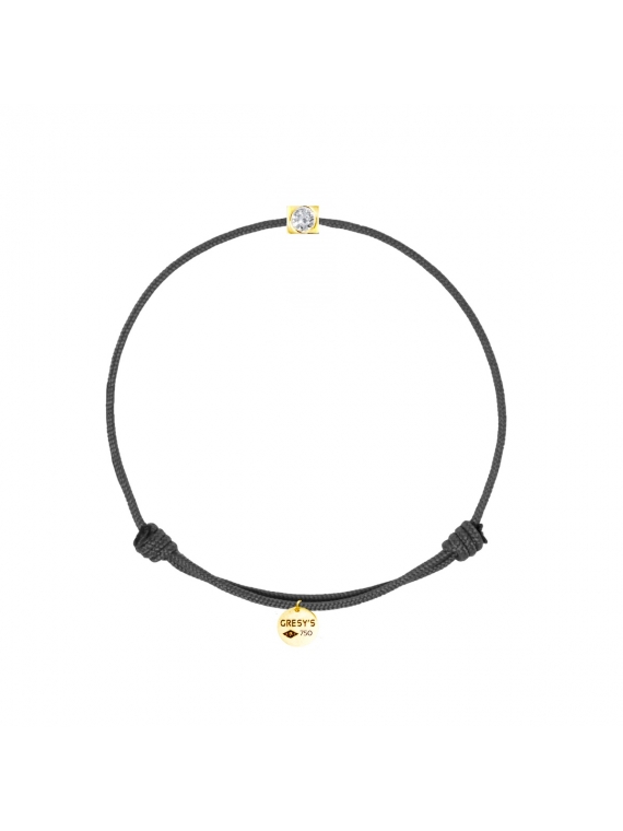Bracelet taille enfant, logo et sertissure en or jaune 750/1000, diamant 0.03ct (diamètre 2,00mm) de qualité H/SI1. Cordon ajustable par noeuds coulissants. Livré dans un sac cadeau, une pochette en velours gravée de la marque et son certificat d’authenticité par colissimo recommandé sous 48 à 72H.