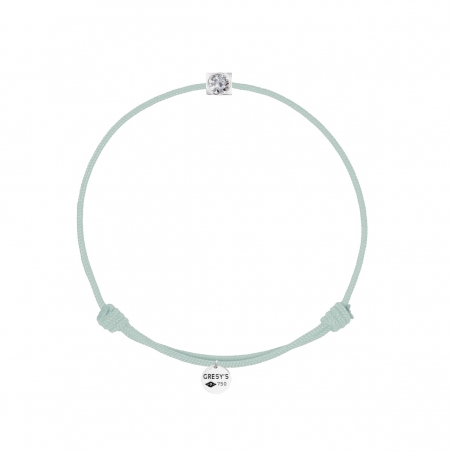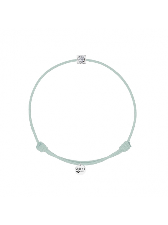Bracelet taille enfant, logo et sertissure en or 750/1000 blanc rhodié, diamant 0.10ct (diamètre 3,00mm) de qualité H/SI1. Cordon ajustable par noeuds coulissants. Livré dans un sac cadeau, une pochette en velours gravée de la marque et son certificat d’authenticité par colissimo recommandé sous 48 à 72H.