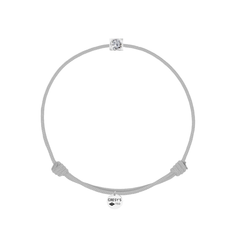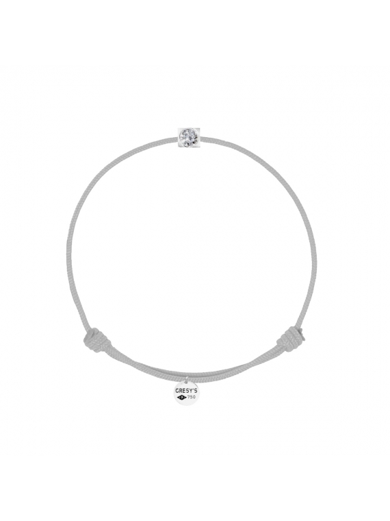 Bracelet taille enfant, logo et sertissure en or 750/1000 blanc rhodié, diamant 0.10ct (diamètre 3,00mm) de qualité H/SI1. Cordon ajustable par noeuds coulissants. Livré dans un sac cadeau, une pochette en velours gravée de la marque et son certificat d’authenticité par colissimo recommandé sous 48 à 72H.