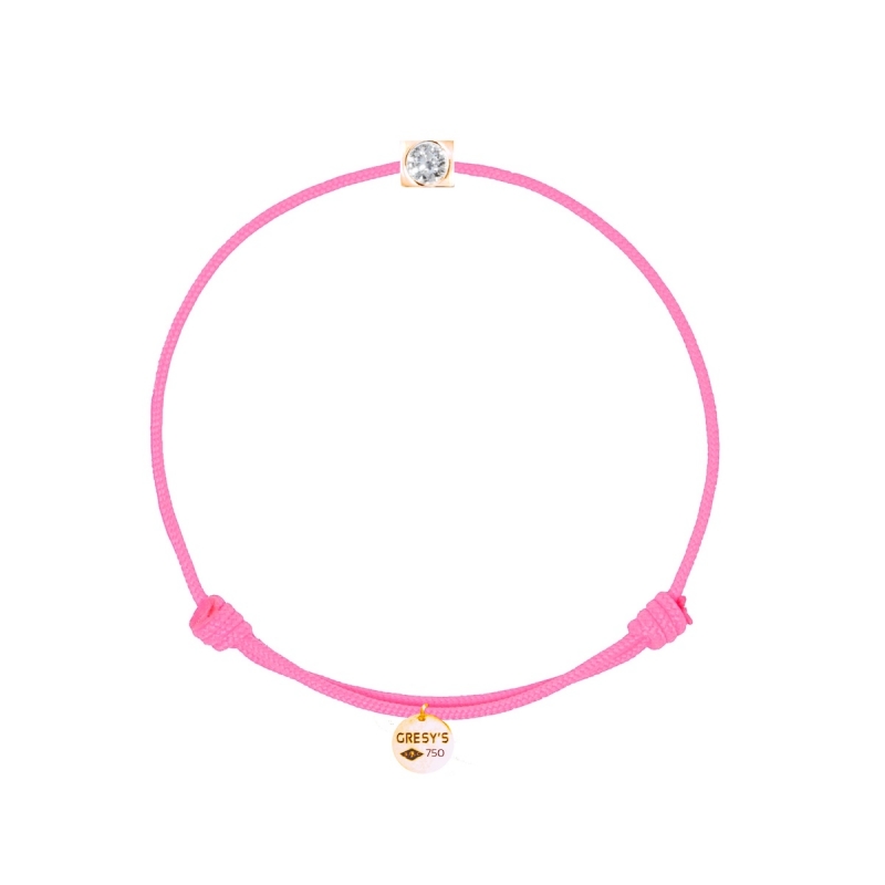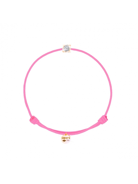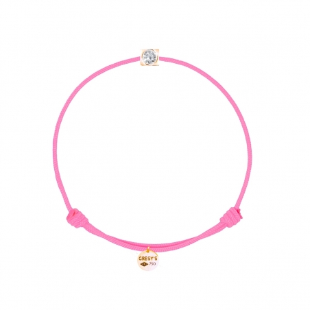 Bracelet taille enfant, logo et sertissure en or rose 750/1000, diamant 0.05ct (diamètre 2,5mm) de qualité H/SI1. Cordon ajustable par noeuds coulissants. Livré dans un sac cadeau, une pochette en velours gravée de la marque et son certificat d’authenticité par colissimo recommandé sous 48 à 72H.