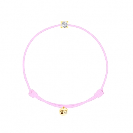 Bracelet taille femme, logo et sertissure en or jaune 750/1000, diamant 0.10ct (diamètre 3,00mm) de qualité H/SI1. Cordon ajustable par noeuds coulissants. Livré dans un sac cadeau, une pochette en velours gravée de la marque et son certificat d’authenticité par colissimo recommandé sous 48 à 72H.