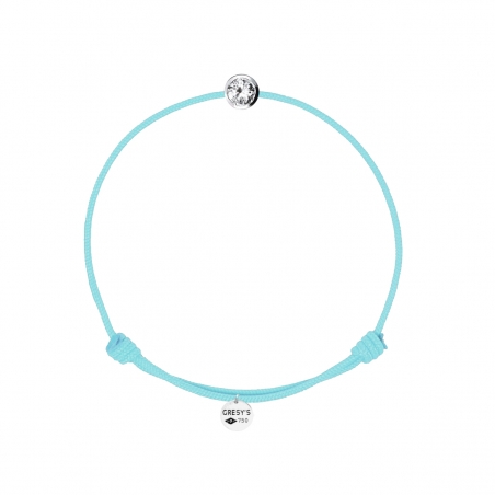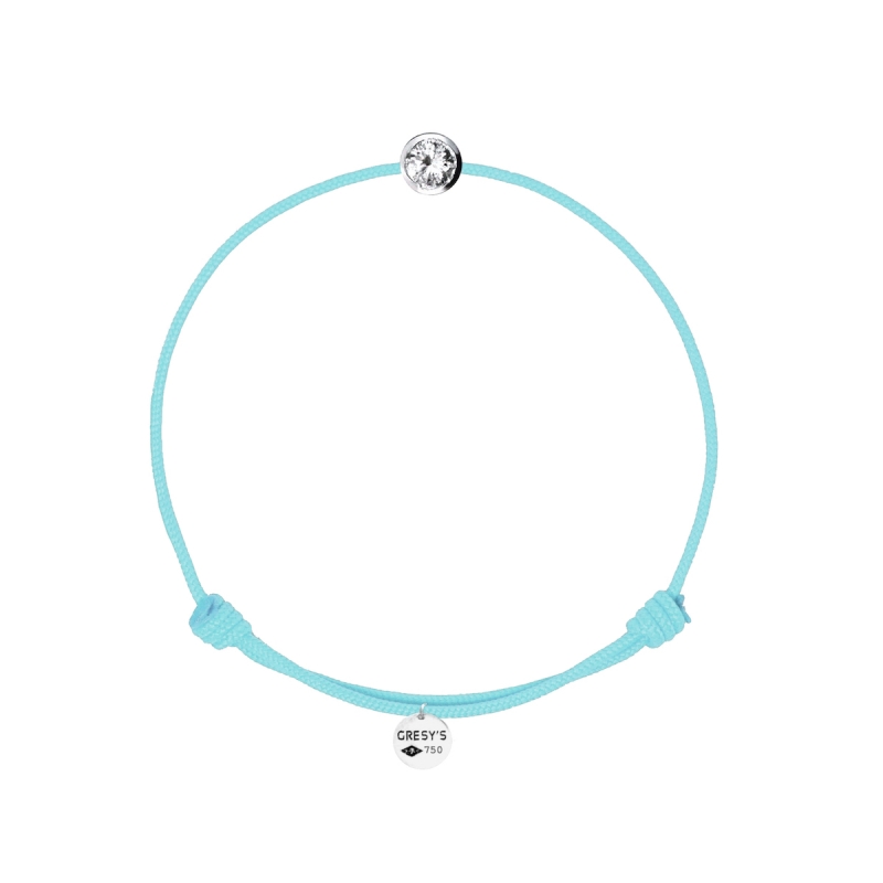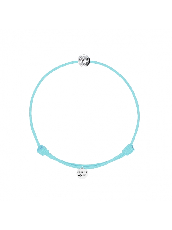 Bracelet taille enfant, logo et motif en or blanc 750/1000 rhodié, diamant 0.10ct (diamètre 3.00mm) de qualité H/SI1. Cordon ajustable par noeuds coulissants. Livré dans une pochette en velours gravée de la marque et son certificat d’authenticité par colissimo recommandé sous 48 à 72H