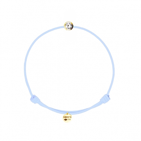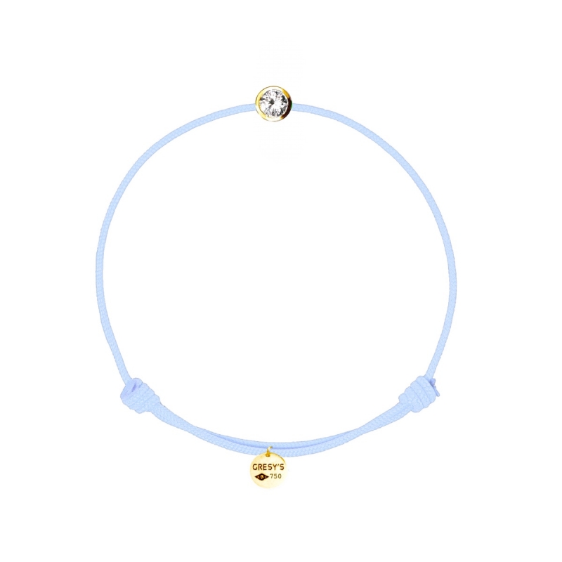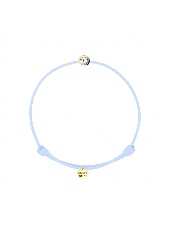 Bracelet taille enfant, logo et motif en or jaune 750/1000, diamant 0.05ct (diamètre 2.5mm) de qualité H/SI1. Cordon ajustable par noeuds coulissants. Livré dans une pochette en velours gravée de la marque et son certificat d’authenticité par colissimo recommandé sous 48 à 72H.
