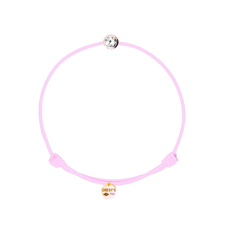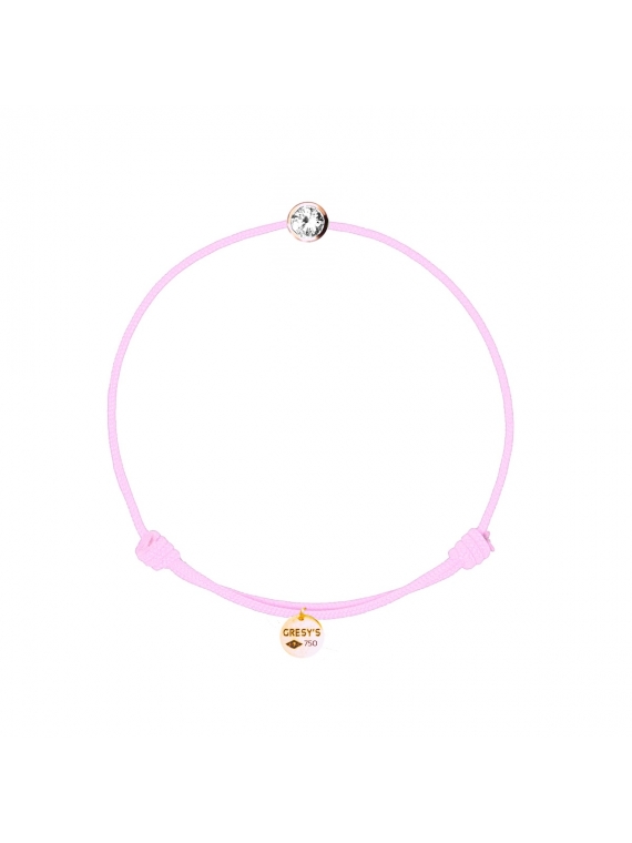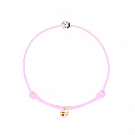 Bracelet taille femme, logo et motif en or rose 750/1000, diamant 0.05ct (diamètre 2.5mm) de qualité H/SI1. Cordon ajustable par noeuds coulissants. Livré dans une pochette en velours gravée de la marque et son certificat d’authenticité par colissimo recommandé sous 48 à 72H.