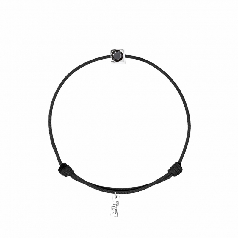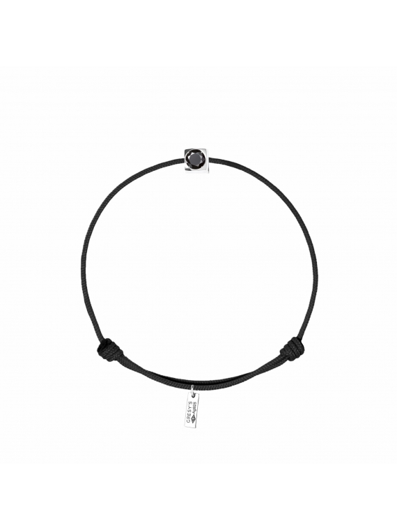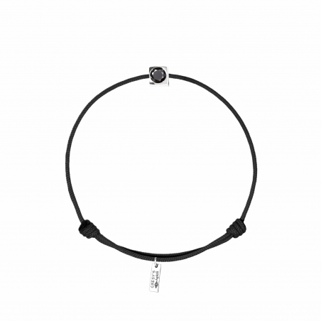 Bracelet taille femme, logo et sertissure en argent 925/1000 rhodié, diamant noir 0.10ct (diamètre 3mm). Cordon ajustable de par noeuds coulissants. Livré dans un sac cadeau, une pochette en velours gravée de la marque et son certificat d’authenticité par colissimo recommandé sous 48 à 72H.